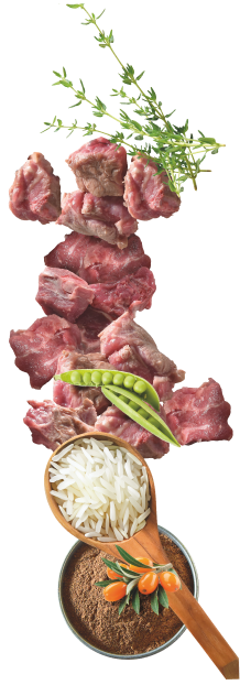 Skład: Suszona jagnięcina (27%), ryż (26%), groszek (13%), jagnięcina bez kości (9%), płatki ziemniaczane (6%), tłuszcz drobiowy, suszona pulpa buraczana (4%), hydrolizowane białko zwierzęce, drożdże (2%), siemię lniane (1%), składniki mineralne, olej z łososia (0,5%), wyciąg z jukki shidigera (0,2 %), ActiveMOS (0,2 %), MACROGARD (0,1 %), rokitnik (0,1%), zioła (rozmaryn, tymianek, pietruszka, 0,1%), siarczan chondroityny (270 mg/kg), siarczan glukozaminy (200 mg/kg).